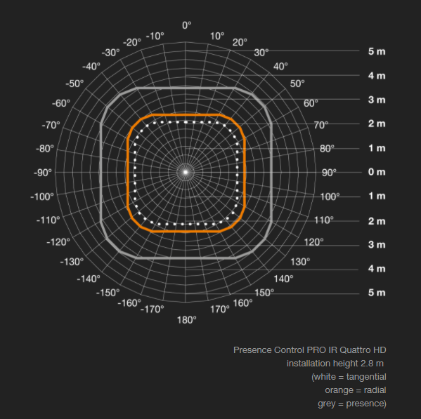Infrared presence detector Presence Control PRO IR Quattro COM1 for indoors, ideal for small offices, store, service and utility rooms, washrooms and WCs, installation height up to 8 m, for switching light 'ON' and 'OFF', 1760 switching zones for excellent detection quality, square presence detection zone covering 16 m2, mechanically scalable.